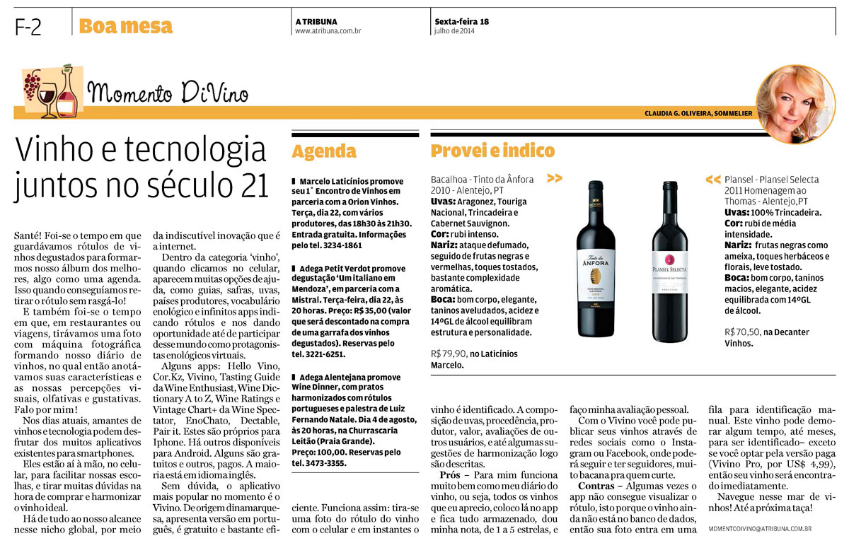 Momento DiVino "Vinho e tecnologia no século 21" 18/07/2014 - A Tribuna Jornal - Santos/SP
