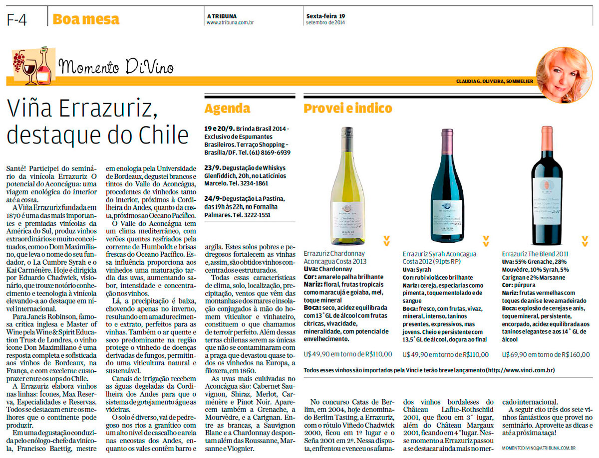 A Viña Errazuriz fundada em 1870 é uma das mais importantes e premiadas vinícolas da América do Sul, produz vinhos extraordinários e muito conceituados, como o Dom Maximiliano, que leva o nome do seu fundador, o La Cumbre Syrah e o Kai Carménère. Hoje é dirigida por Eduardo Chadwick, visionário, que trouxe notório conhecimento e tecnologia à vinícola elevando-a ao destaque em nível internacional.