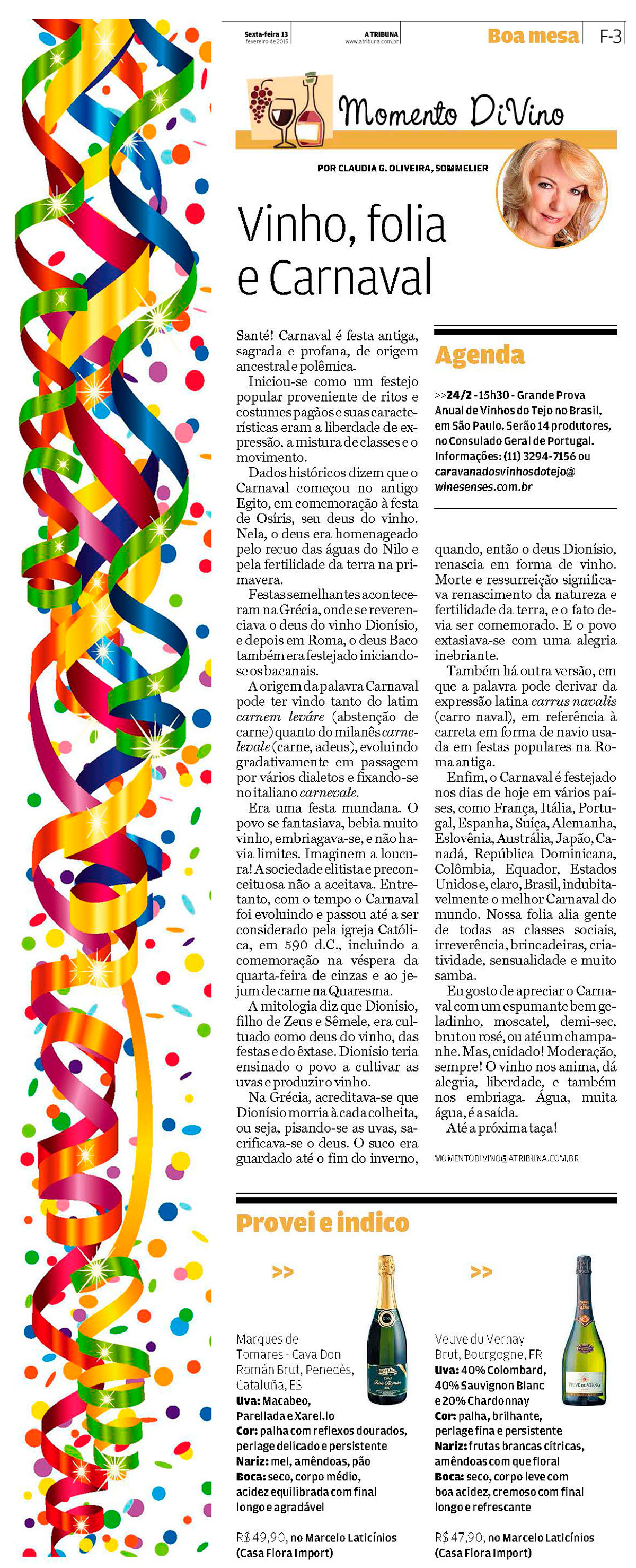 Eu gosto de apreciar o carnaval com um espumante bem geladinho, moscatel, demi-sec, brut ou rosé, ou até um champanhe! Mas cuidado! Moderação sempre! O vinho nos anima, dá alegria, liberdade, e também nos embriaga. Água, muita água, é a saída.