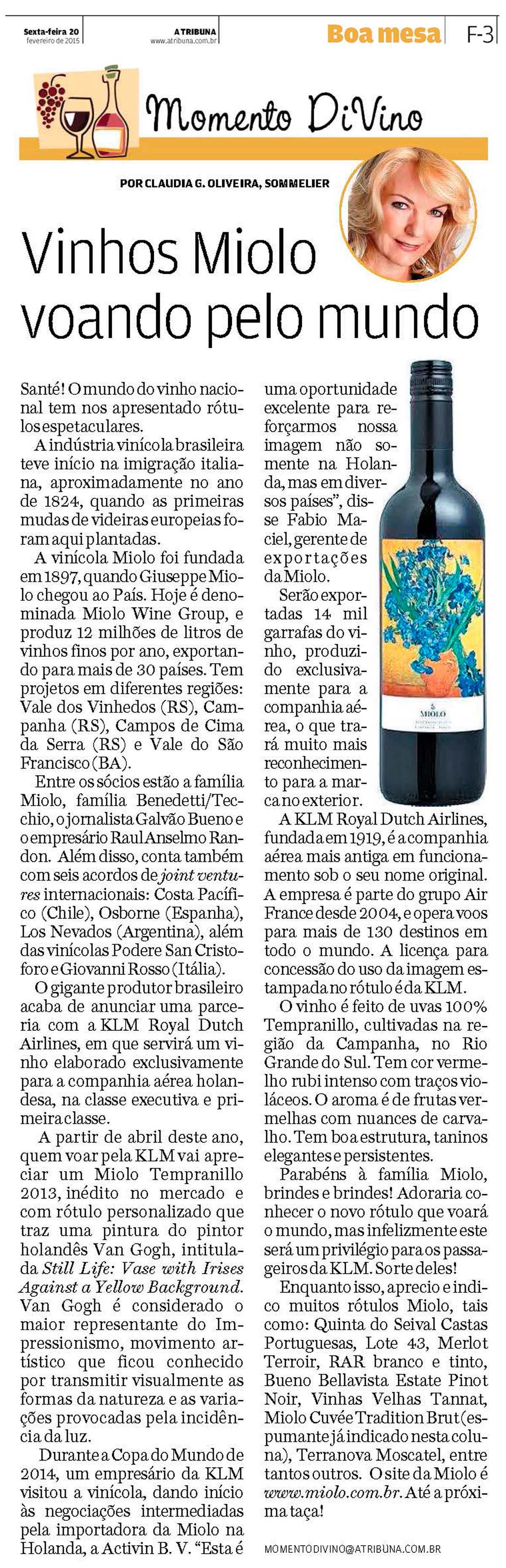 Parabéns à família Miolo, brindes e brindes! Adoraria conhecer o novo rótulo que voará o mundo, mas infelizmente este será um privilégio para os passageiros da KLM. Sorte deles!