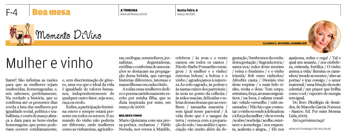Enfim, a participação feminina esteve e sempre estará presente em todos os setores. E no mundo do vinho não poderia ser diferente, onde mulheres como as vinhateiras, agricultoras, enólogas, sommelieres, jornalistas, degustadoras, enófilas e confreiras de associações se destacam na propagação dessa bebida, que carrega histórias diferentes, intensas e maravilhosas em cada rótulo.