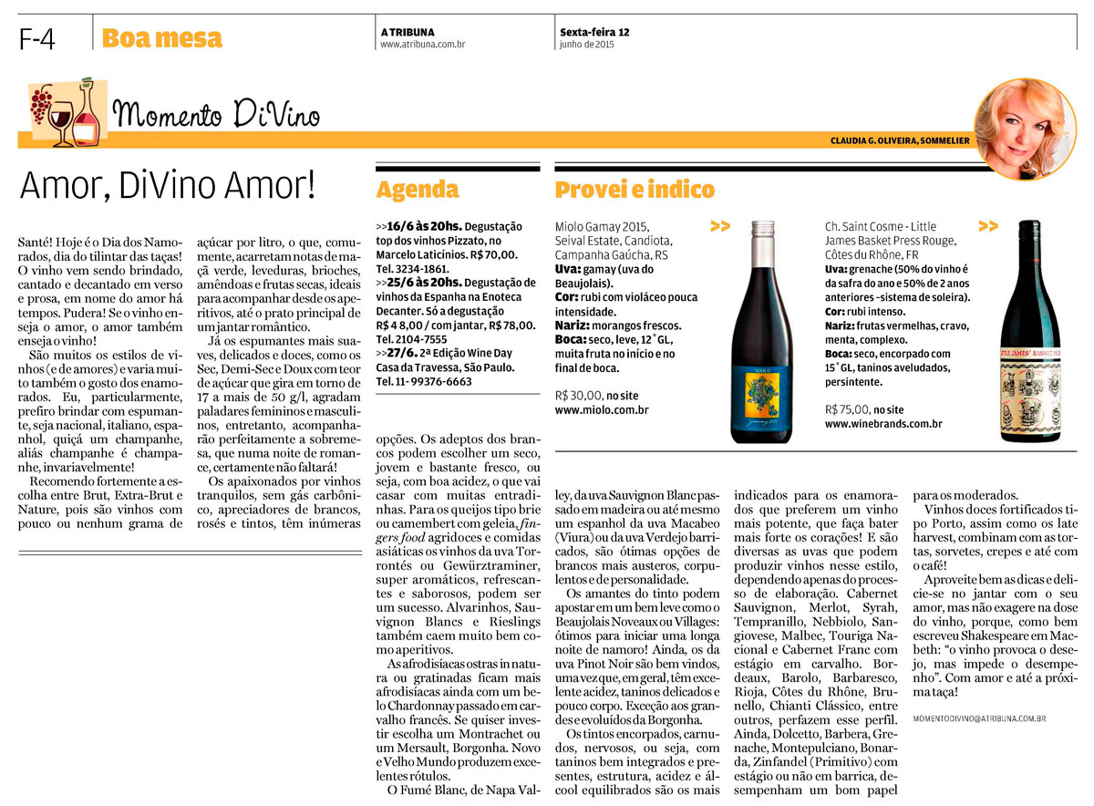 Hoje é o dia dos namorados, dia do tilintar das taças! O vinho vem sendo brindado, cantado e decantado em verso e prosa, em nome do amor há tempos.Pudera! Se o vinho enseja o amor, o amor também enseja o vinho!