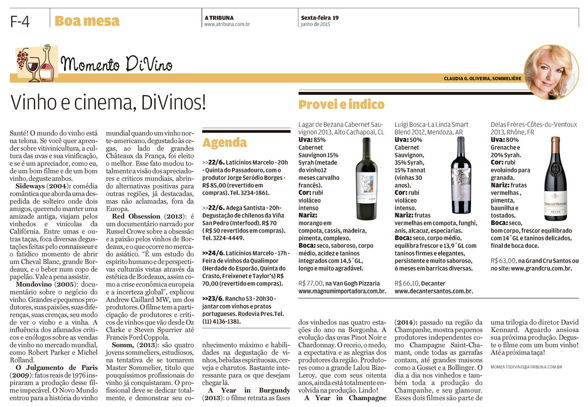 22/06 Adega Santista - 20h - Degustação de vinhos chilenos da Viña San Pedro (Interfood). R$ 70 R$ 50 (revertidos em compras). Tel. 3224-4449.