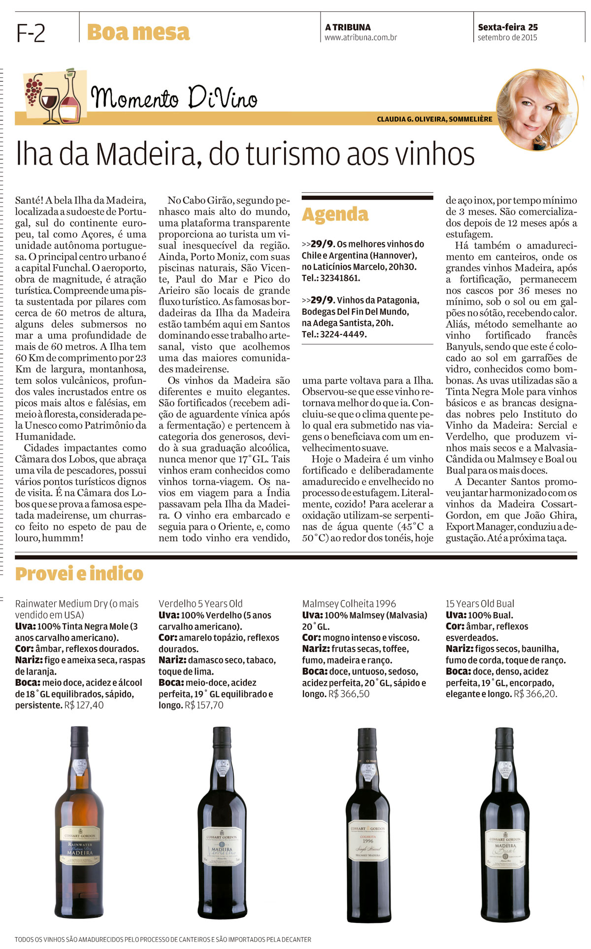 Momento DiVino "Ilha da Madeira, do turismo aos vinhos" 25/09/15 - A Tribuna Jornal - Santos/SP