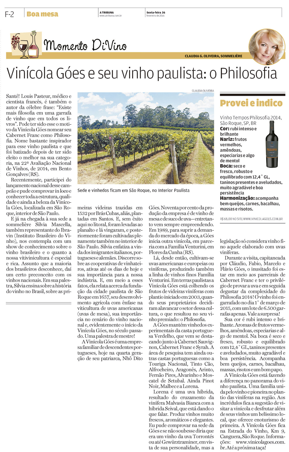 Louis Pasteur, médico e cientista francês, é também o autor da célebre frase: "Existe mais filosofia em uma garrafa de vinho que em todos os livros". Pode ter sido esse o motivo da Vinícola Góes nomear seu Cabernet Franc por "Philosofia". Nome bastante inspirador para esse vinho paulista e que foi batizado depois de ter sido eleito o melhor na sua categoria, na 22ª. Avaliação Nacional de Vinhos, de 2014, em Bento Gonçalves, RS.