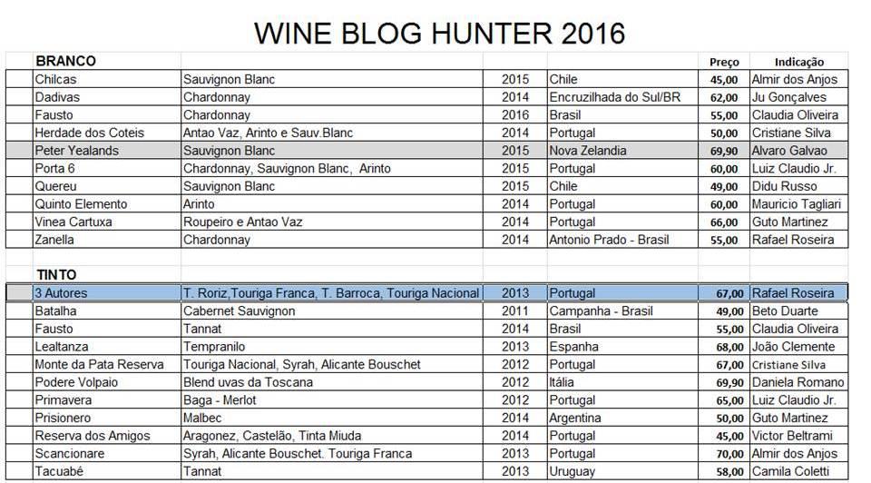 O vencedor na categoria branco foi o Peter Yealands Sauvignon Blanc 2015, Nova Zelândia, com custo de R$69,90, escolhido pelo enoamigo, muito querido, Álvaro Cézar Galvão do Divino Guia – O engenheiro que virou vinho (http://www.divinoguia.com.br), bela escolha, parabéns! Já o tinto foi o 3 Autores Douro 2013, Portugal no valor de R$67,00 escolhido pelo enoamigo Rafael Roseira (http://www.terroirs.com.br), grande vinho!