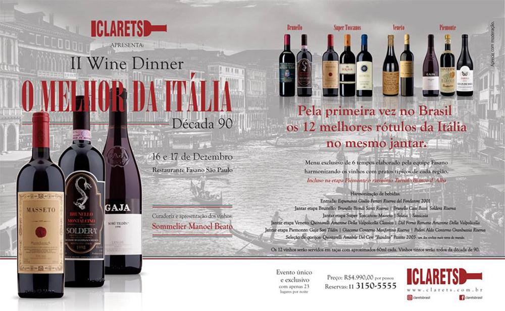 Imagine um jantar com os melhores pratos da cozinha italiana harmonizados com os 12 melhores e mais consagrados vinhos da Itália! E mais: com vinhos provenientes das mesmas regiões dos pratos! Pois esse jantar acontecerá nos dias 16 e 17 de dezembro, em São Paulo, em mais uma parceria entre o Hotel Fasano e a importadora de vinhos Clarets.