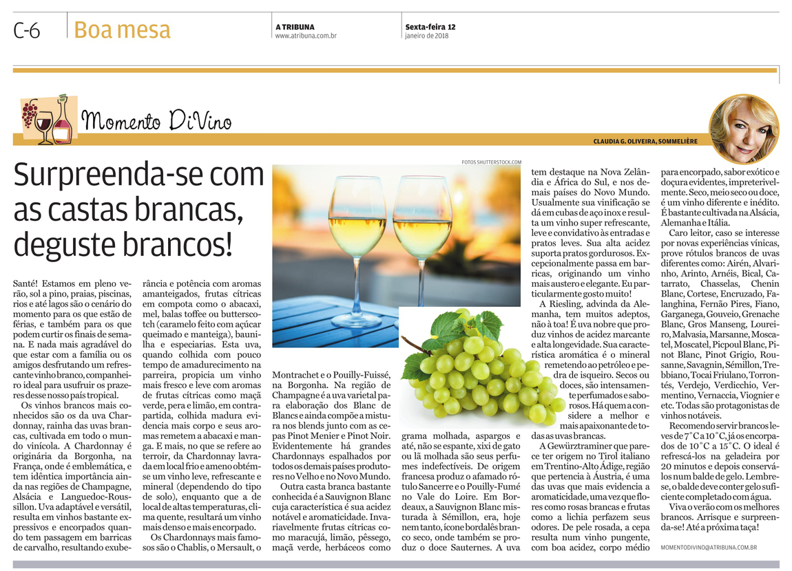 Caro leitor, caso se interesse por novas experiências vínicas, prove rótulos brancos de uvas diferentes como: Airén, Alvarinho, Arinto, Arnéis, Bical, Catarrato, Chasselas, Chenin Blanc, Cortese, Encruzado, Falanghina, Fernão Pires, Fiano, Garganega, Gouveio, Grenache Blanc, Gros Manseng, Loureiro, Malvasia, Marsanne, Moscatel, Moscatel, Picpoul Blanc, Pinot Blanc, Pinot Grigio, Rousanne, Savagnin, Sémillon, Trebbiano, Tocai Friulano, Torrontés, Verdejo, Verdicchio, Vermentino, Vernaccia, Viognier e etc. Todas são protagonistas de vinhos notáveis.