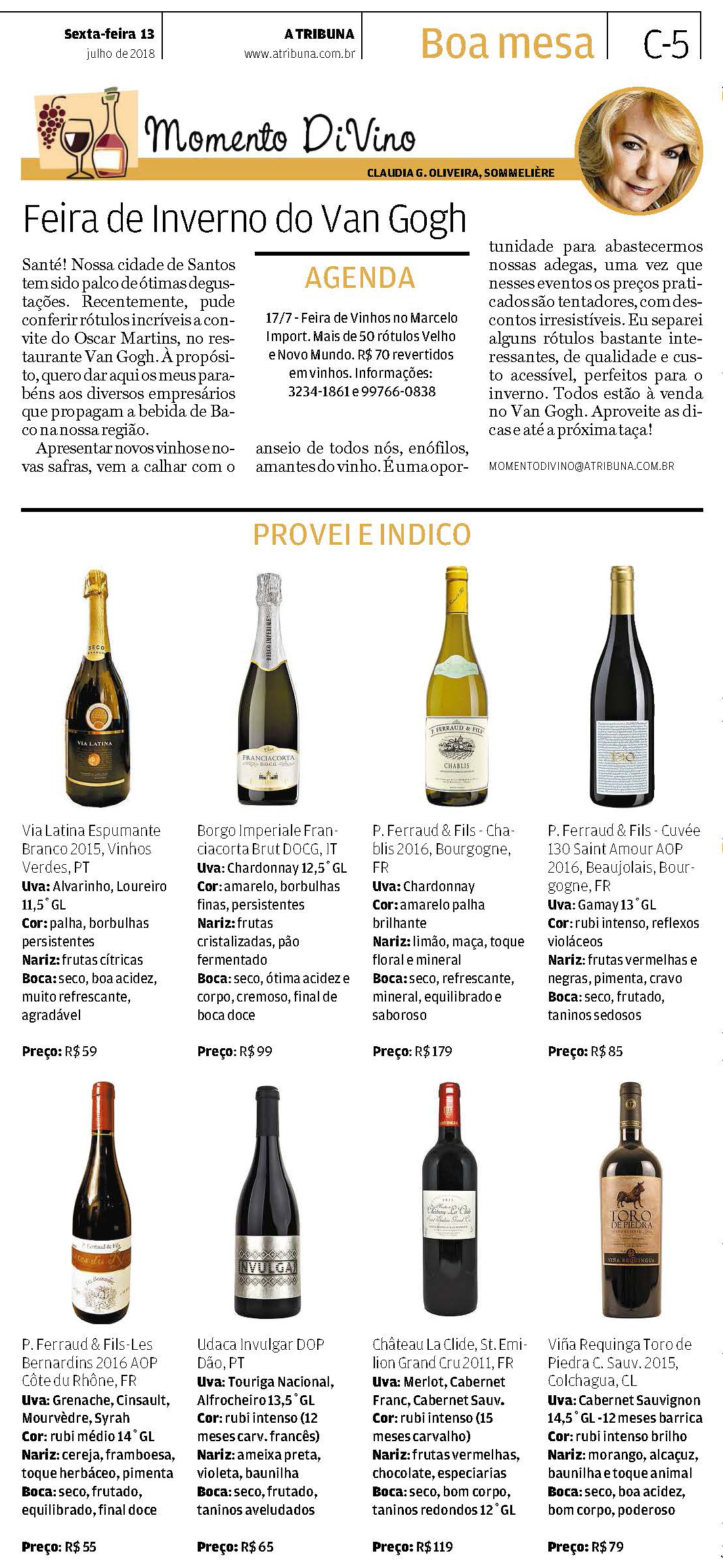 Santé! Nossa cidade de Santos tem sido palco de ótimas degustações. E recentemente pude conferir rótulos incríveis a convite do Oscar Martins, no restaurante Van Gogh. À propósito, quero dar aqui os meus parabéns aos diversos empresários que propagam a bebida de Baco na nossa região. Apresentar novos vinhos e novas safras, vem a calhar com o anseio de todos nós, enófilos, amantes do vinho. É uma oportunidade para abastecermos nossas adegas, uma vez que nesses eventos os preços praticados são tentadores, com descontos irresistíveis. Eu separei alguns rótulos bastante interessantes, de qualidade e custo acessível, perfeitos para o inverno.
