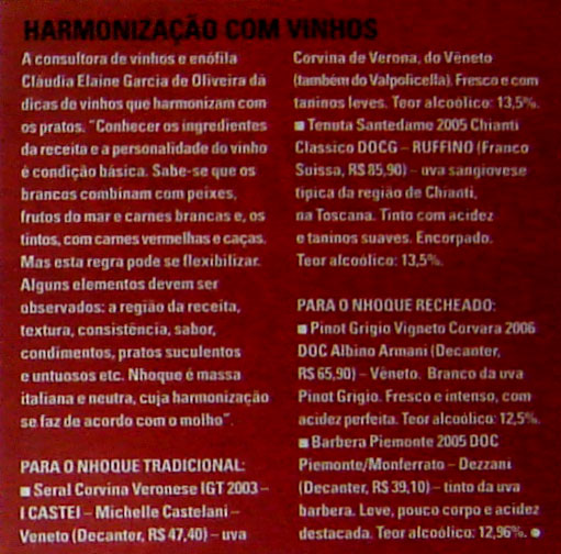 Assim, para o nhoque tradicional, com molho de tomates, sugerimos duas opções de vinhos tintos: - Seral Corvina Veronese IGT 2003 - I CASTEI - Michelle Castelani - Veneto (Decanter, R$ 47,40) - uva Corvina de Verona, do Vêneto (região que produz também os vinhos na área de Valpolicella, originando os vinhos do mesmo nome, bem como o Amarone). Características: vinho tinto com muito frescor (acidez) e taninos leves, compatíveis com os 13,5% de álcool, casando mito bem com a acidez do molho de tomates.