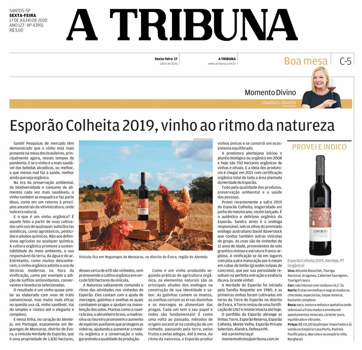 Provei recentemente a safra 2019 do Esporão Colheita, engarrafado em junho do mesmo ano, recém lançado. É o autêntico e delicioso orgânico da Esporão. Sandra Alves é a enóloga responsável, sob os olhos do premiado enólogo australiano David Baverstock que conduz também outras vinícolas do grupo. As uvas são de vinhedos de 12 anos de idade, provenientes de solo granítico xistoso e estrutura franco-argilosa. A vinificação se dá em lagares com pisa a pé e maturação por 6 meses em cubas de betão (grandes tulipas de concreto), que por sua porosidade resultam na perfeita extração e essência da uva. Grande vinho!