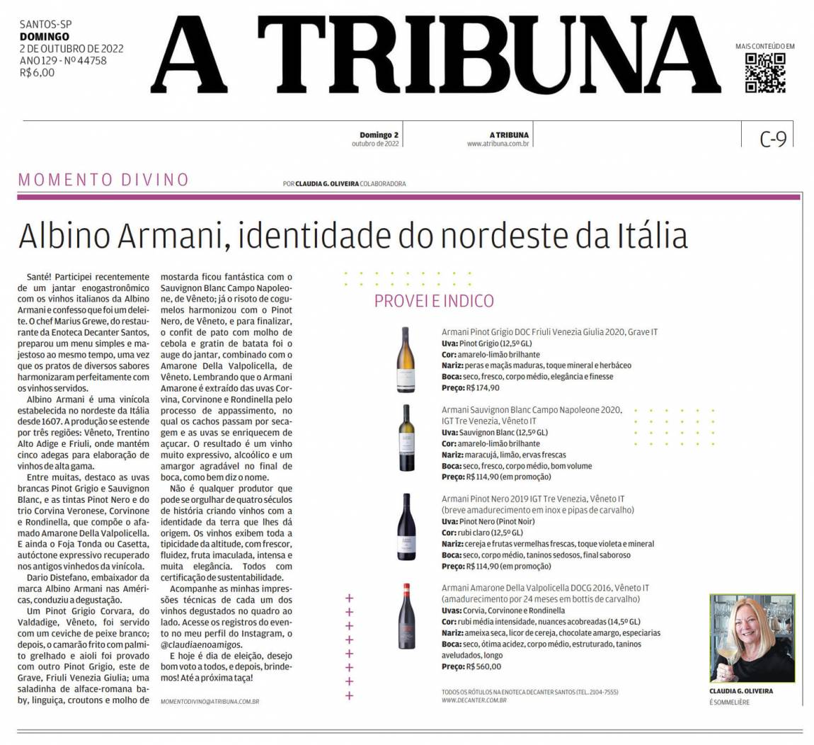 Santé! Participei recentemente de um jantar enogastronômico com os vinhos italianos da Albino Armani, confesso que foi um deleite. O Chef Marius Grewe, do restaurante da Enoteca Decanter Santos, preparou um menu simples e majestoso ao mesmo tempo, uma vez que os pratos de diversos sabores harmonizaram perfeitamente com os vinhos servidos.