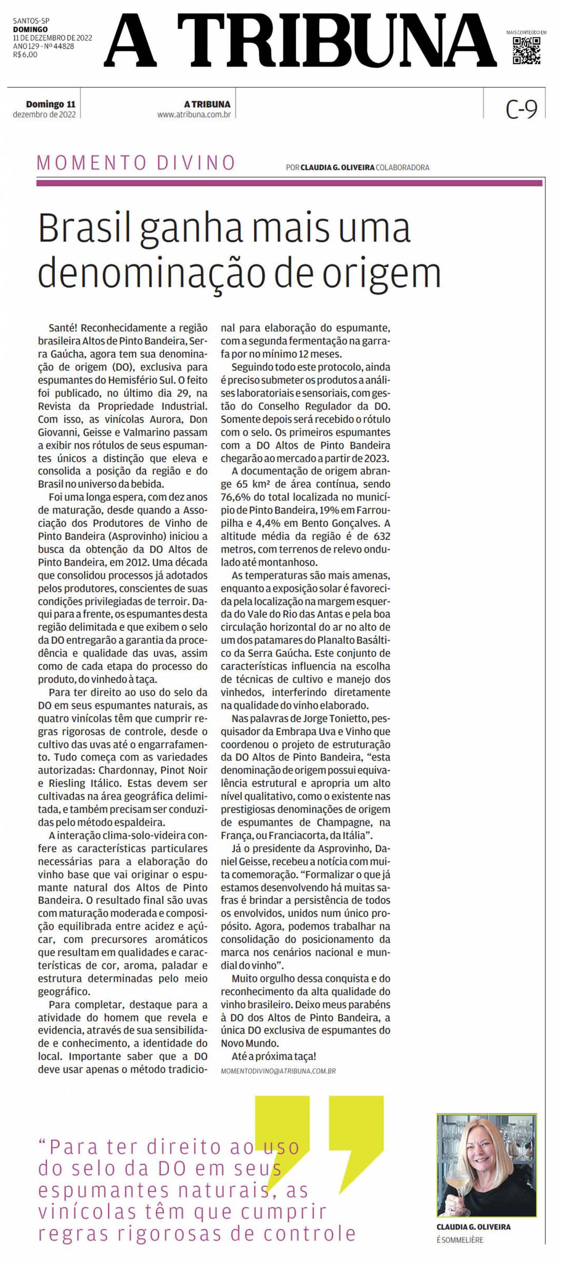 Muito orgulho dessa conquista e do reconhecimento da alta qualidade do vinho brasileiro, e, os meus parabéns à DO dos Altos de Pinto Bandeira, a única DO exclusiva de espumantes do Novo Mundo.