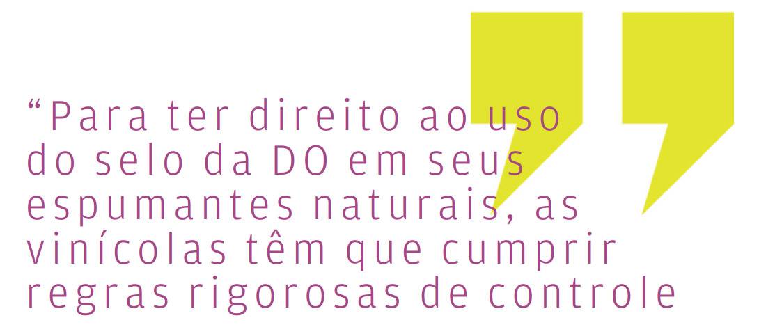 Para ter direito ao uso do Selo da DO em seus espumantes naturais, as vinícolas Aurora, Don Giovanni, Geisse e Valmarino têm que cumprir regras rigorosas de controle, desde o cultivo das uvas até o engarrafamento. Tudo começa com as variedades autorizadas: Chardonnay, Pinot Noir e Riesling Itálico. Estas devem ser cultivadas na área geográfica delimitada, e também precisam ser conduzidas pelo método espaldeira. A interação clima-solo-videira conferem as características particulares necessárias para a elaboração do vinho base que vai originar o espumante natural dos Altos de Pinto Bandeira. O resultado são uvas com maturação moderada e composição equilibrada entre acidez e açúcar, com precursores aromáticos que resultam em qualidades e características de cor, aroma, paladar e estrutura determinadas pelo meio geográfico. Para completar, destaque para a atividade do homem que revela e evidencia, através de sua sensibilidade e conhecimento, a identidade do local. Importante saber que a DO deve usar apenas o Método Tradicional para elaboração do espumante, com a segunda fermentação na garrafa por no mínimo 12 meses.