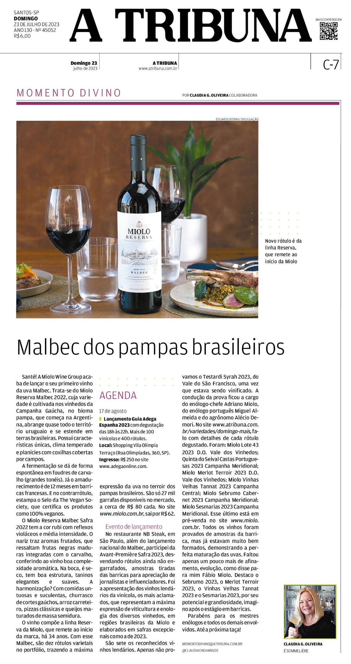 Santé! A Miolo Wine Group acaba de lançar o seu primeiro vinho da uva Malbec. Trata-se do Miolo Reserva Malbec 2022, cuja variedade é cultivada nos vinhedos da Campanha Gaúcha, no Bioma Pampa, que começa na Argentina, abrange quase todo o território uruguaio e se estende em terras brasileiras. Possui características únicas, clima temperado e planícies com coxilhas cobertas por campos.