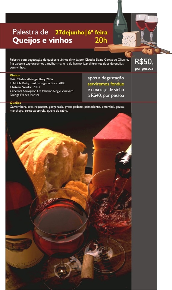 Palestra com degustação de vinhos e queijos dirigida por Cláudia Elaine Garcia de Oliveira.