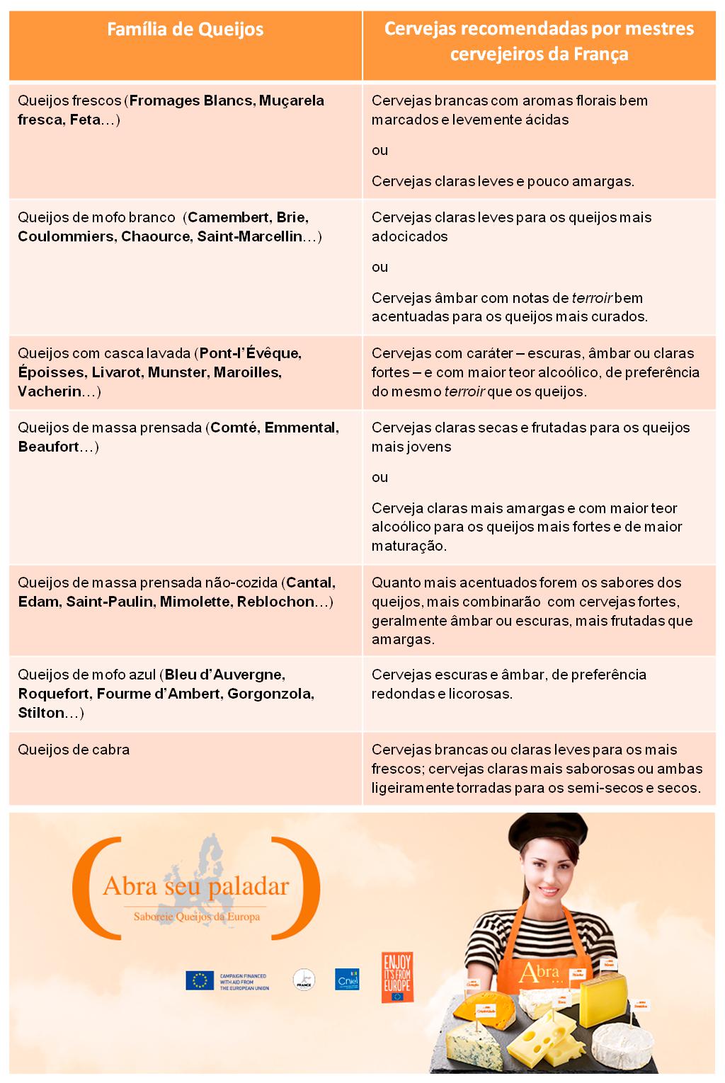 Uma boa dica para se aproveitar ainda mais o verão, é unir os variados sabores dos deliciosos queijos da campanha "Abra Seu Paladar" dos Queijos da Europa, realizada pelo CNIEL (Centro Nacional Interprofissional da Economia Leiteira da França) e pela União Europeia, ao de cervejas especiais. Esse casamento de sabores e texturas, tradicional na Europa, ganha cada dia mais a preferência dos brasileiros.