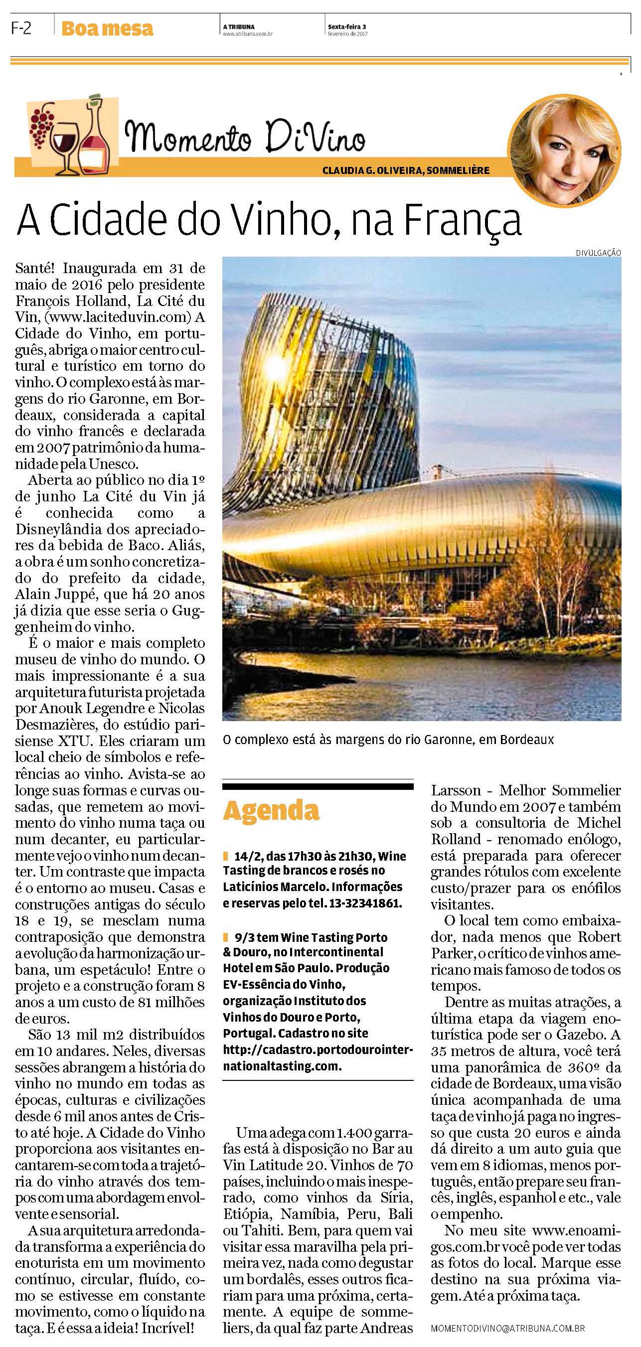 Santé! Inaugurada em 31 de maio de 2016 pelo presidente François Holland, La Cité du Vin, (http://www.laciteduvin.com) A Cidade do Vinho, em português, abriga o maior centro cultural e turístico em torno do vinho. O complexo está às margens do rio Garonne, em Bordeaux, considerada a capital do vinho francês e declarada em 2007 patrimônio da humanidade pela Unesco.