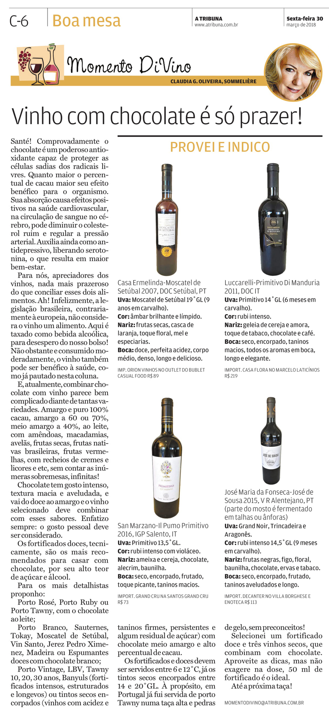 Selecionei um fortificado doce e três vinhos secos, que combinam com chocolate. Aproveite as dicas, mas não exagere na dose, 50 ml de fortificado é o ideal.