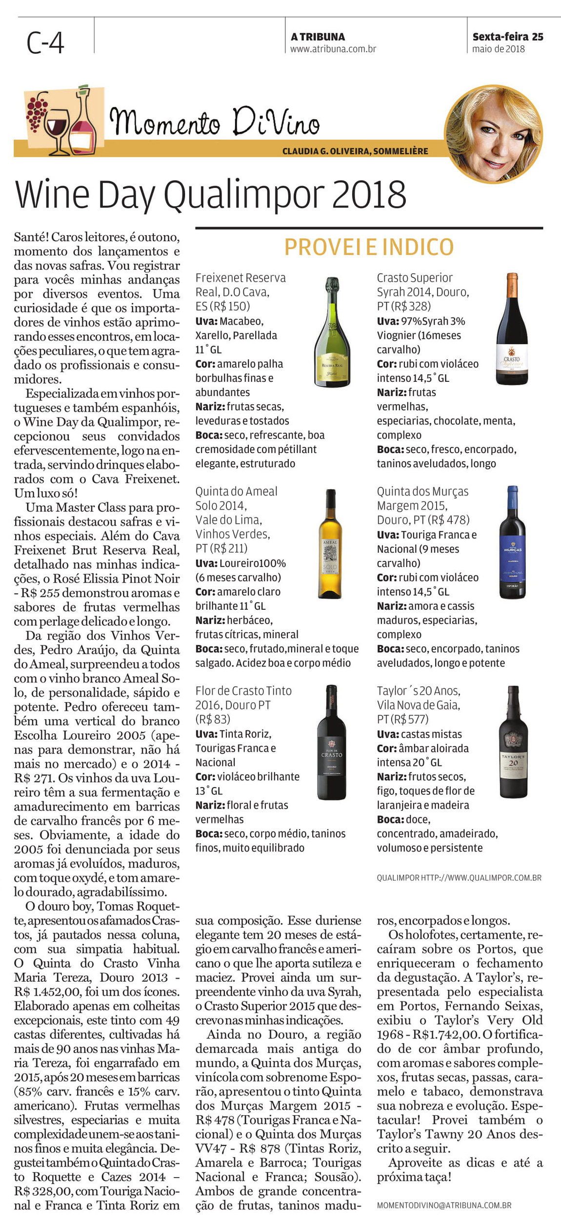 O douro boy, Tomas Roquette, apresentou os afamados Crastos, já pautados nessa coluna, com sua simpatia habitual. O Quinta do Crasto Vinha Maria Tereza, Douro 2013 - R$1.452,00, foi um dos ícones. Elaborado apenas em colheitas excepcionais, este tinto com 49 castas diferentes, cultivadas há mais de 90 anos nas vinhas Maria Tereza, foi engarrafado em 2015, após 20 meses em barricas (85% carv. francês e 15% carv. americano). Frutas vermelhas silvestres, especiarias e muita complexidade unem-se aos taninos finos e muita elegância. Degustei também o Quinta do Crasto Roquette e Cazes 2014 – R$328,00, com Touriga Nacional e Franca e Tinta Roriz em sua composição. Esse duriense elegante tem 20 meses de estágio em carvalho francês e americano o que lhe aporta sutileza e maciez. Provei ainda um surpreendente vinho da uva Syrah, o Crasto Superior 2015 que descrevo nas minhas indicações, um super vinho!