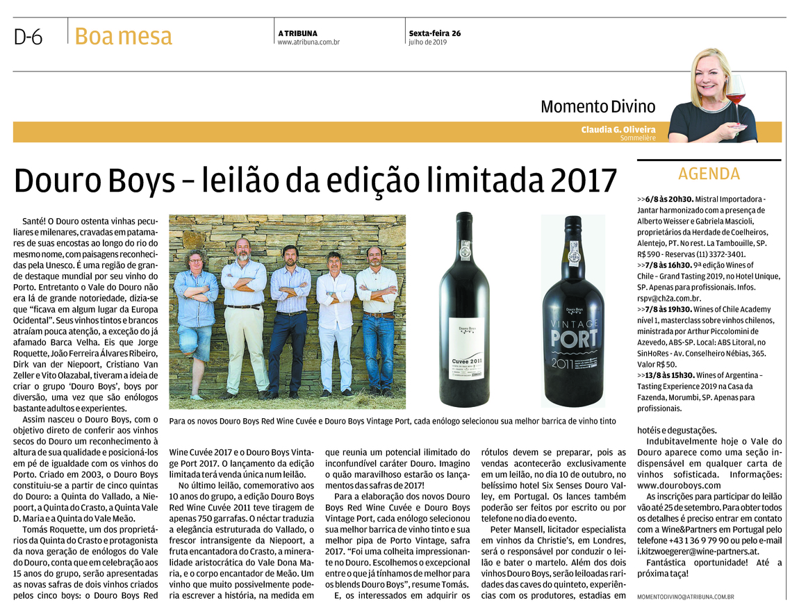 No último leilão, comemorativo aos 10 anos do grupo, a edição Douro Boys Red Wine Cuvée 2011 teve tiragem de apenas 750 garrafas. O néctar traduzia a elegância estruturada do Vallado, o frescor intransigente da Niepoort, a fruta encantadora do Crasto, a mineralidade aristocrática do Vale Dona Maria, e o corpo encantador de Meão. Um vinho que muito possivelmente poderia escrever a história, na medida em que reunia um potencial ilimitado do inconfundível caráter Douro. Imagino o quão maravilhoso estarão os lançamentos das safras de 2017!