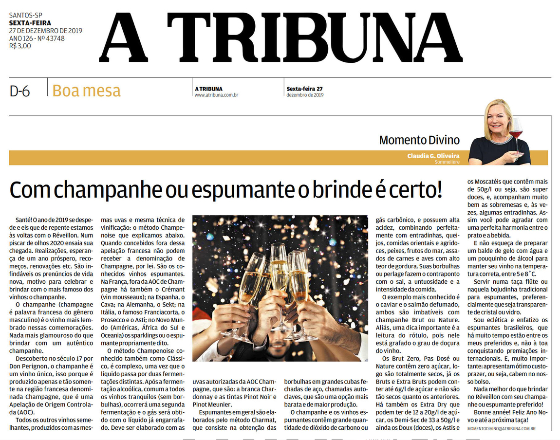 Santé! O ano de 2019 se despede e eis que derepente estamos às voltas com o Réveillon. Num piscar de olhos 2020 ensaia sua chegada. Realizações, esperança de um ano próspero, recomeços, renovações etc. São infindáveis os prenúncios de vida nova, motivo para celebrar e brindar com o mais famoso dos vinhos: o champanhe.