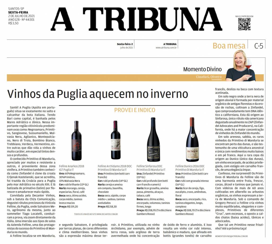 Convidada pela Decanter Vinhos, sob a batuta da Ch2a Comunicação, degustei rótulos preciosos da Vinícola Felline, da Puglia, onde Salvatore Mero, agrônomo da mesma, junto ao sommelier Tiago Locatelli, conduziram a prova, via zoom diretamente da Itália. Uma imersão aos tipos de solos da Azienda Felline, uma das protagonistas do sucesso do Primitivo di Manduria no mundo.