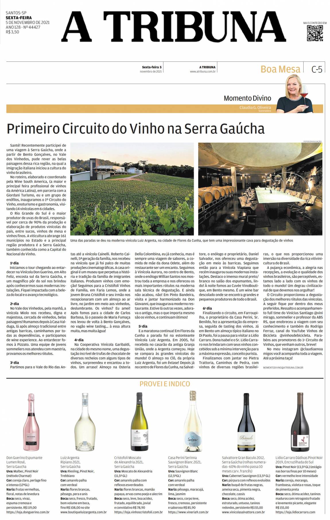Santé! Recentemente participei de uma viagem à Serra Gaúcha, onde a partir de Bento Gonçalves, no Vale dos Vinhedos, pude rever as belas paisagens dessa rica região, na qual a imigração italiana iniciou a cultura do vinho brasileiro. No roteiro, elaborado e coordenado pela Wine South America, (a maior e principal feira profissional de vinhos da América Latina), em parceria com a Giordani Turismo, eu e um grupo de enófilos, inauguramos o 1º Circuito do Vinho, enoturismo e gastronomia, visitando 14 vinícolas em 6 cidades.