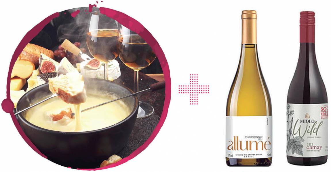Combinar queijos e vinhos é um tanto complexo devido aos infindáveis tipos de ambos, mas, no caso do fondue, atente-se para o fato de que no preparo o vinho branco é condição sine qua non, e nada mais lógico do que combinar o prato com um branco fresco, frutado e com certa personalidade. Acerte na mosca com um Chardonnay com passagem em madeira ou não. As uvas Sauvignon Blanc, Pinot Grigio, Riesling e até Gewürztraminer também caem muito bem. E se você não abre mão de um tinto, pode escolher um leve, frutado. Fica delicioso. Os fondues de carne pedem tinto encorpado para ir ao encontro da suculência da carne e da variedade de molhos.