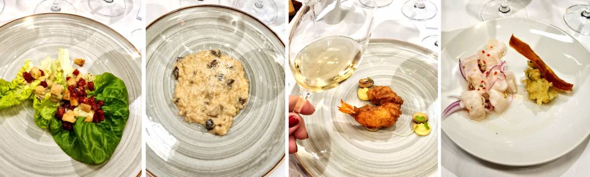 Um Pinot Grigio Corvara, do Valdadige, Vêneto, foi servido com um ceviche de peixe branco; após o camarão frito com palmito grelhado a aioli foi provado com outro Pinot Grigio, este de Grave, Friuli Venezia Giulia; uma saladinha de alface baby romana, linguiça, croutons e molho de mostarda ficou fantástica com o Sauvignon Blanc Campo Napoleone, Vêneto; já o risoto de cogumelos harmonizou com o Pinot Nero, Vêneto e para finalizar o confit de pato com molho de cebola e gratin de batata foi o auge do jantar combinado com o Amarone Della Valpolicella, Vêneto. Lembrando que o Armani Amarone é extraído das uvas Corvina, Corvinone e Rondinela pelo processo de appassimento, no qual os cachos passam por secagem e as uvas se enriquecem de açucar. O resultado é um vinho muito expressivo, alcoólico e um amargor agradável no final de boca, como bem diz o nome.