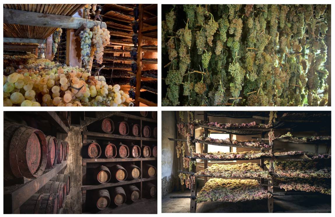 Após a seleção dos cachos, as uvas são escolhidas à mão e transportadas para a “vinsantaia”, um local fechado da adega, bem-posicionado e ventilado (tradicionalmente no sótão com aberturas para perfeita ventilação). Em seguida, acontece a secagem ou apassimento, que ocorre com as uvas dispostas em uma esteira ou penduradas em suportes. A circulação de ar em torno dos cachos somada à distância adequada entre eles vai ditar o sucesso do procedimento. Esta desidratação lenta e suave começa no mês de setembro e pode durar de 3 a 6 meses.
