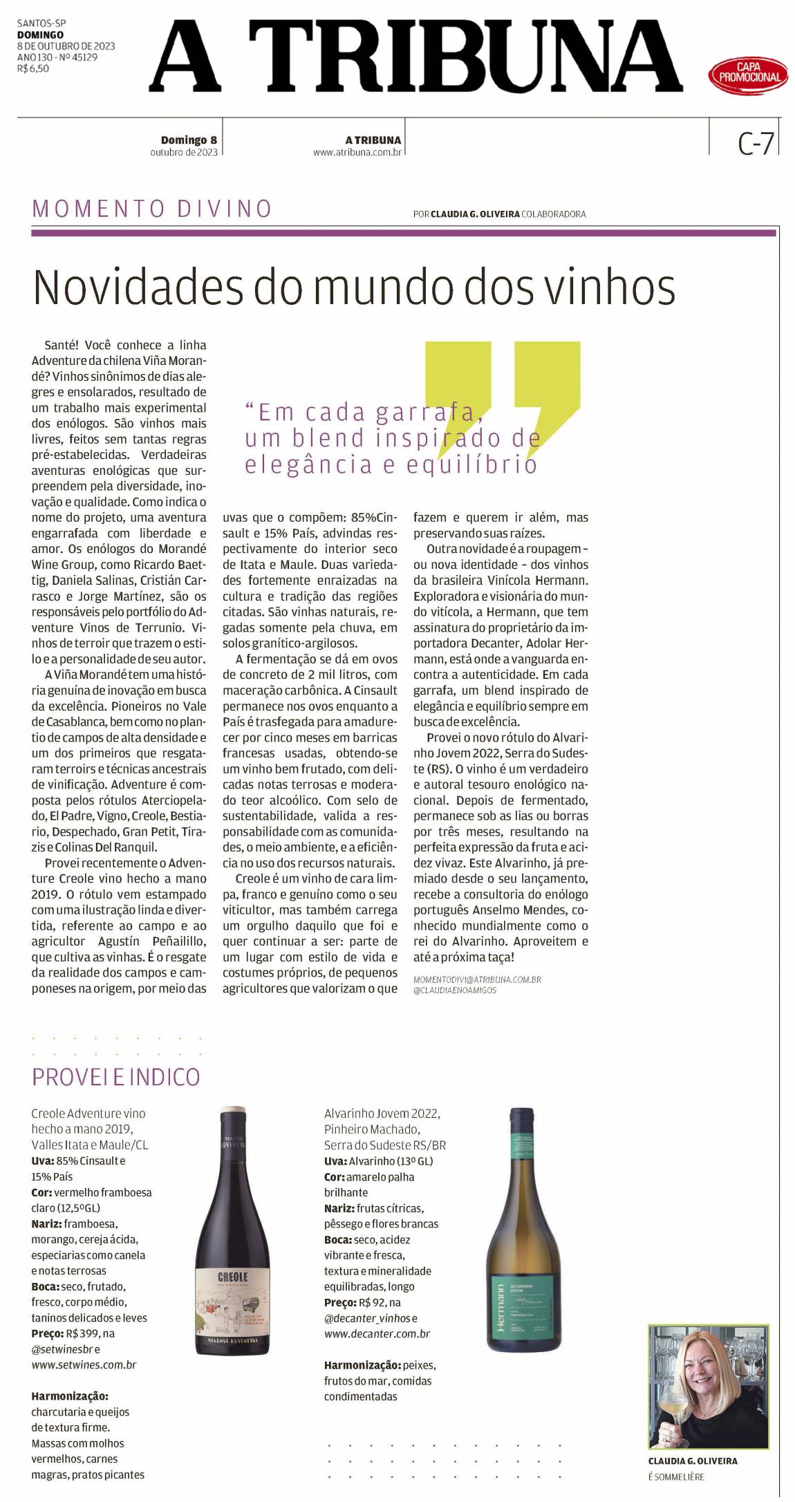 Santé! Você conhece a linha Adventure da chilena Viña Morandé? Vinhos sinônimos de dias alegres e ensolarados, resultado de um trabalho mais experimental dos enólogos. São vinhos mais livres, feitos sem tantas regras pré-estabelecidas. São aventuras enológicas que surpreendem pela diversidade, inovação e qualidade. Como indica o nome do projeto, uma aventura engarrafada com liberdade e amor. Os enólogos do Morandé Wine Group como Ricardo Baettig, Daniela Salinas, Cristián Carrasco e Jorge Martínez são os responsáveis pelo portfólio dos Adventure Vinos de Terrunio. Vinhos de terroir que trazem o estilo e a personalidade de seu autor.