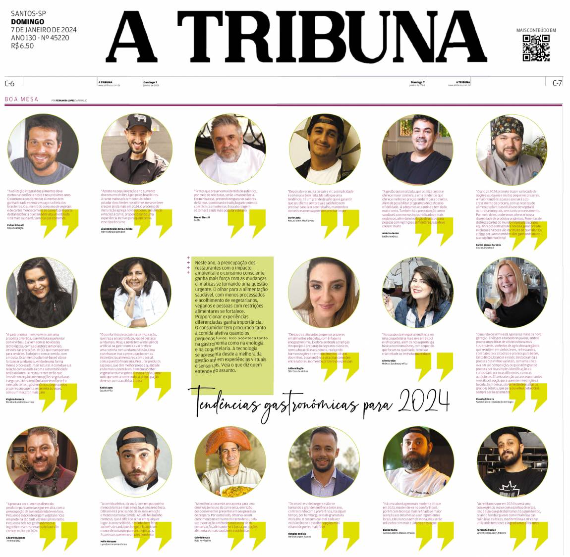 "Pratos que preservam a identidade autêntica, por meio de releituras, serão uma tendência. Em minha casa, pretendo resgatar os sabores de Santos, combinando tradição gastronômica com técnicas modernas. Essa abordagem se tornará ainda mais popular este ano."