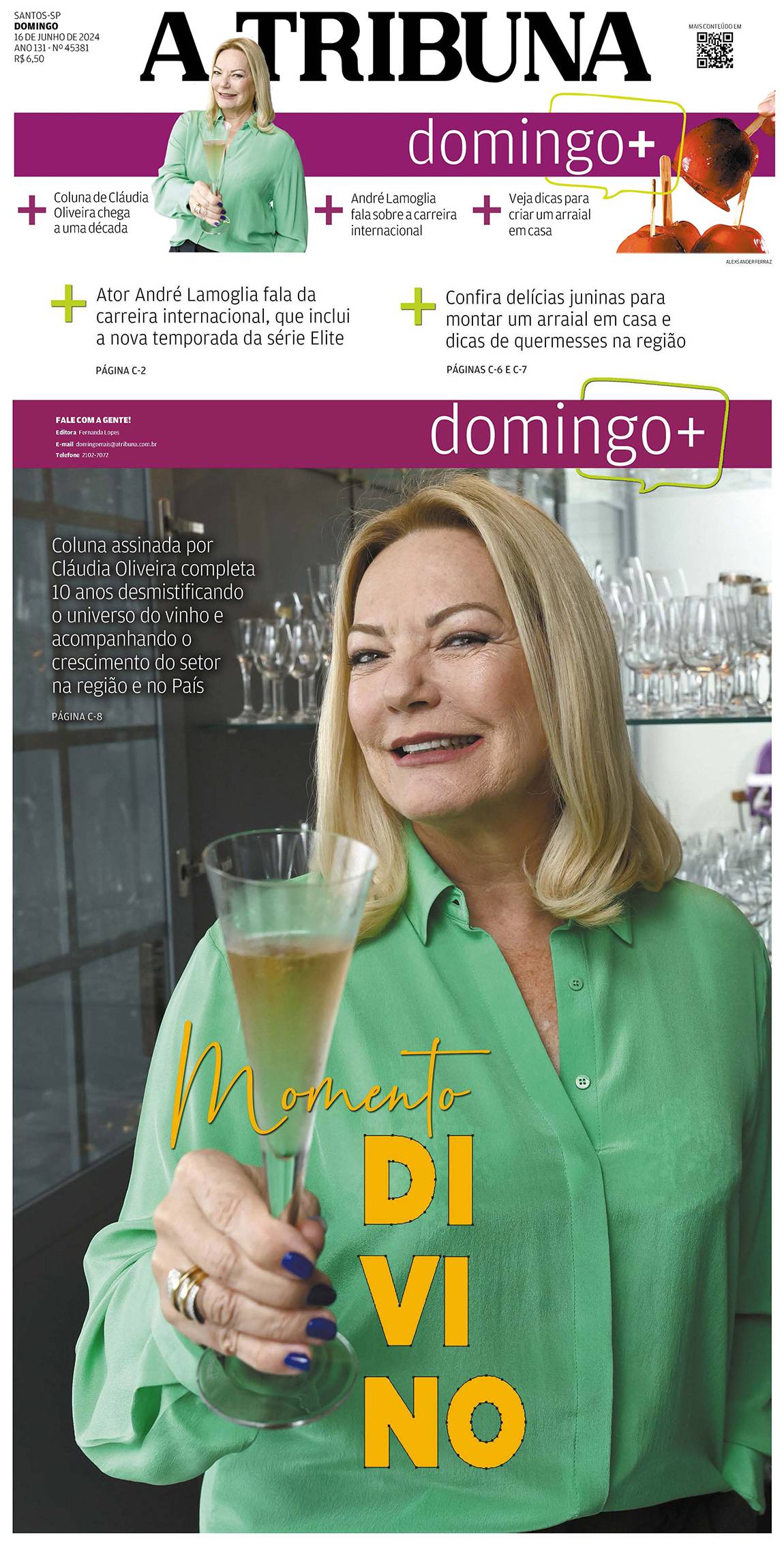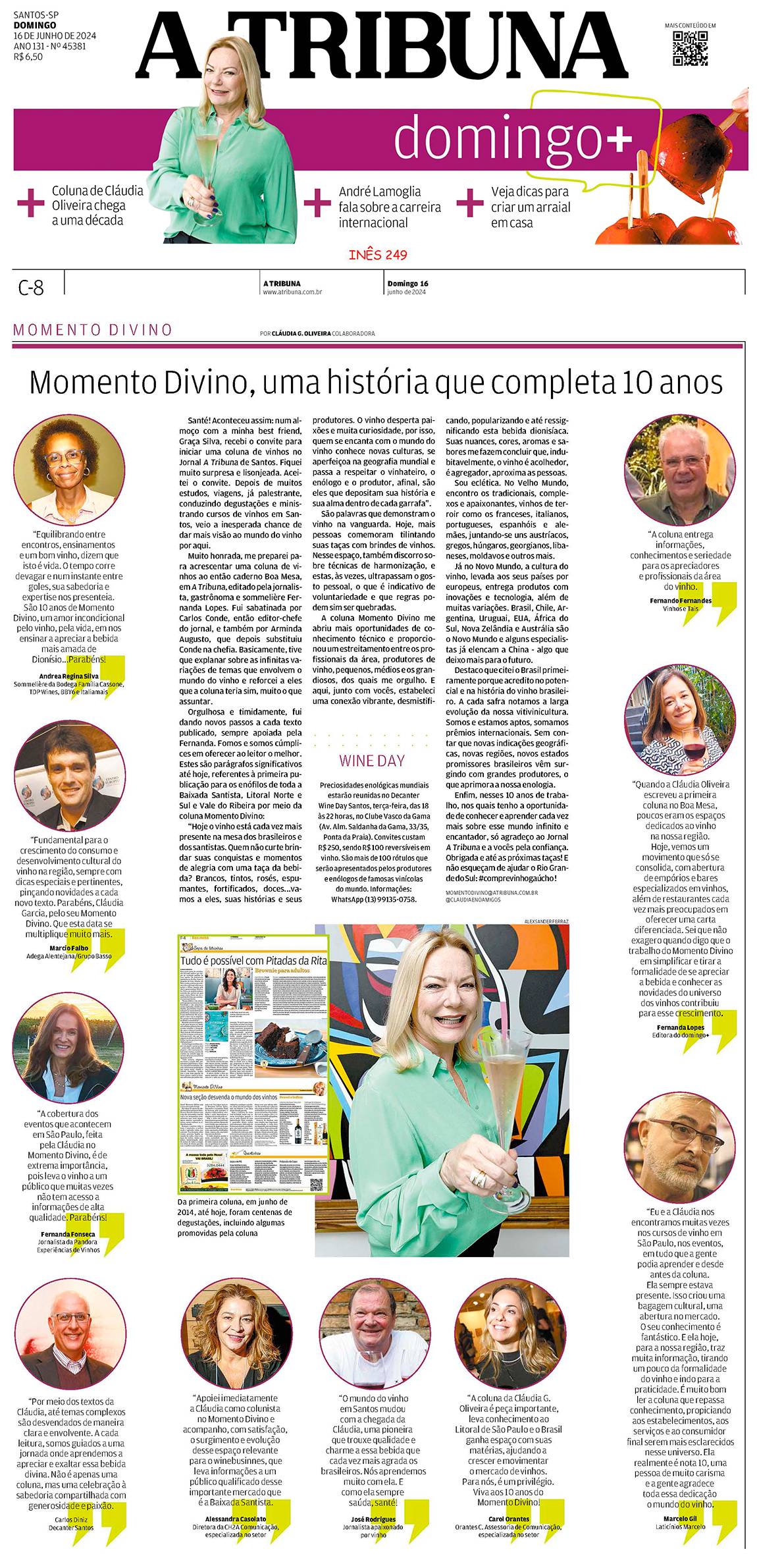 Estes são parágrafos significativos até hoje, da primeira publicação para os enófilos de toda a Baixada Santista, Litoral Norte e Sul e Vale do Ribeira por meio da coluna Momento Divino: “Hoje o vinho está cada vez mais presente na mesa dos brasileiros e dos santistas. Quem não curte brindar suas conquistas e momentos de alegria com uma taça da bebida? Brancos, tintos, rosés, espumantes, fortificados, doces... vamos a eles, suas histórias e seus produtores. O vinho desperta paixões e muita curiosidade, por isso, quem se encanta com o mundo do vinho conhece novas culturas, se aperfeiçoa na geografia mundial e passa a respeitar o vinhateiro, o enólogo e o produtor, afinal, são eles que depositam sua história e sua alma dentro de cada garrafa.”
