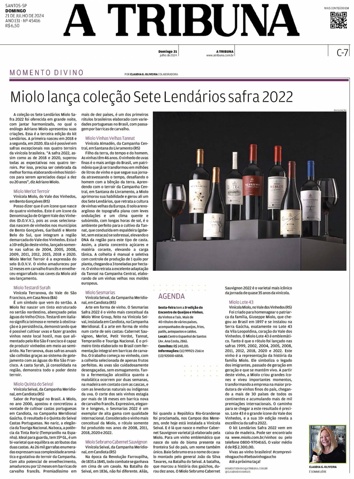 A coleção os Sete Lendários Miolo Safra 2022 foi oferecida em grande noite, com jantar harmonizado, no qual o enólogo Adriano Miolo apresentou suas criações. Essa é a terceira edição do kit Lendários. A primeira nasceu em 2018 e a segunda, em 2020. Ela só é possível em safras excepcionais nos quatro terroirs da vinícola brasileira. “A safra 2022, as sim como as de 2018 e 2020, superou todas as expectativas nos quatro terroirs. Por isso, precisa ser celebrada da melhor forma: elaborando vinhos históricos para serem apreciados daqui a dez ou 20 anos”, diz Adriano Miolo.