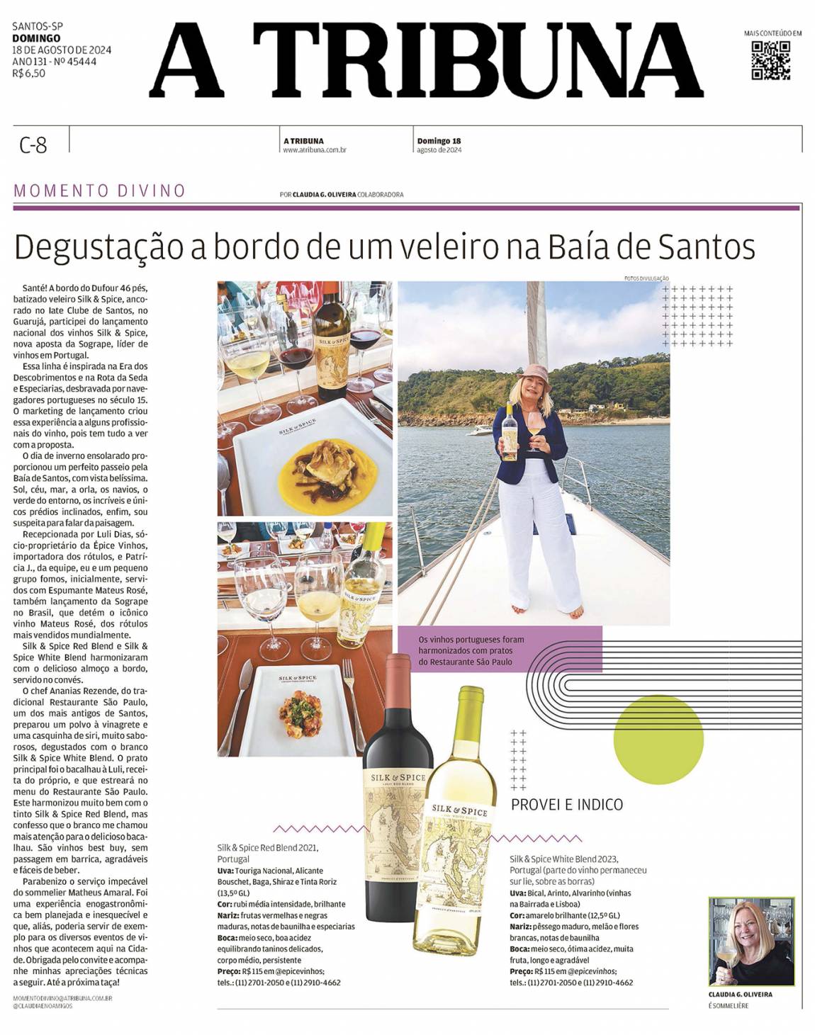 Santé! A bordo do Dufour 46 pés, batizado veleiro Silk & Spice, ancorado no Iate Clube de Santos, no Guarujá, participei do lançamento nacional dos vinhos Silk & Spice, nova aposta da Sogrape, líder de vinhos em Portugal.