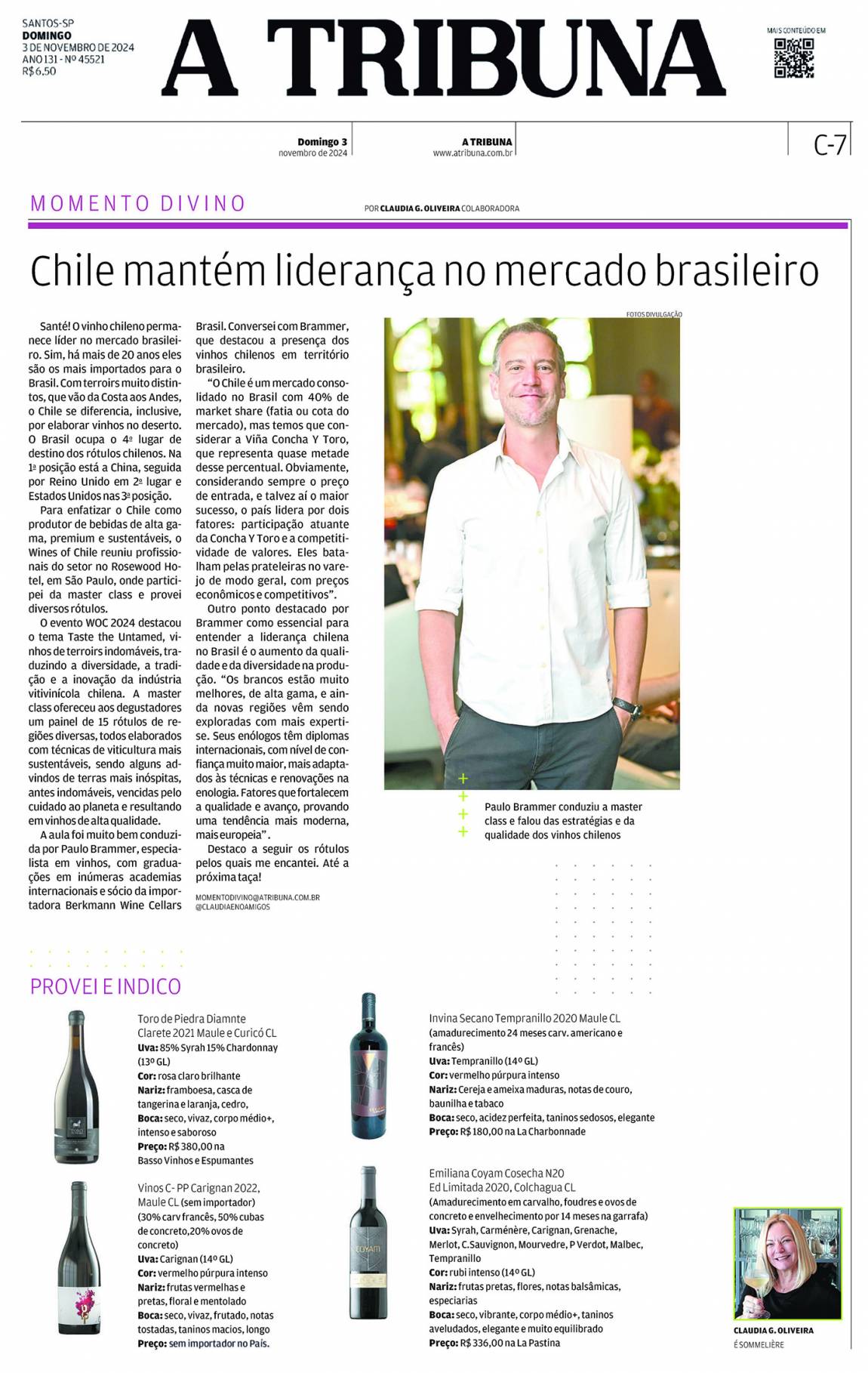 A aula foi muito bem conduzida por Paulo Brammer, especialista em vinhos, com graduações em inúmeras academias internacionais e sócio da importadora Berkmann Wine Cellars Brasil. Conversei com Brammer, que destacou a presença dos vinhos chilenos em território brasileiro.